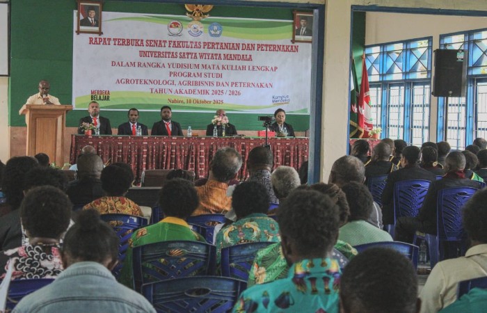 Nabire, Papua Tengah, Faktanabire.com – Rektor Universitas Satya Wiyata Mandala (USWIM) Nabire, Petrus Tekege, menyampaikan pesan penuh makna kepada 67 peserta Yudisium Fakultas Pertanian dan Peternakan yang resmi dinyatakan lulus pada hari Jumat (10/10/2025).