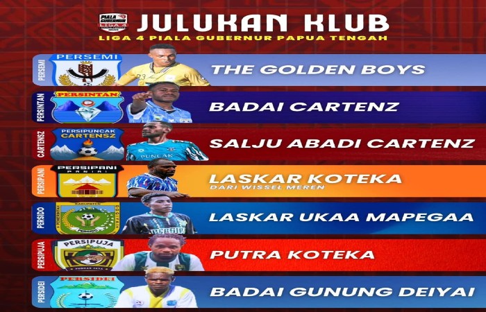 NABIRE, Faktanabire.com – Panitia Pelaksana (Panpel) Liga 4 PSSI Piala Gubernur Papua Tengah Musim 2025/2026 resmi merilis julukan tujuh tim peserta kompetisi melalui akun Instagram resmi @liga4papuatengah_, Selasa (3/3/2026).