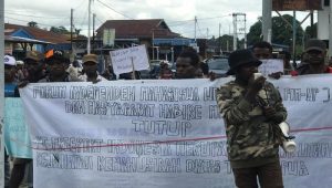 Di Pasar Karang tumaritis, terpantau masa pendemo membawa spanduk bertuliskan “ PT. Freepot Indonesia Merupakan Aktor Utama Kejahatan Kemanusiaan Diatas Tanah Papua”.