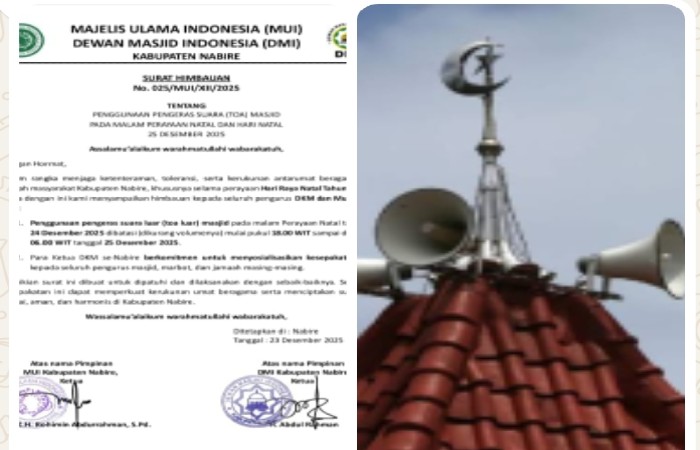 Nabire, 24 Desember 2025, Faktanabire.com – Majelis Ulama Indonesia (MUI) Kabupaten Nabire bersama Dewan Masjid Indonesia (DMI) Kabupaten Nabire mengeluarkan surat himbauan terkait penggunaan pengeras suara (toa) masjid pada malam perayaan Natal dan Hari Natal 2025.